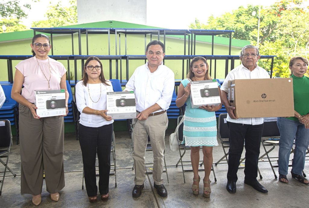 En los edificios escolares se entregaron sillas regulares y con paleta; pintarrones, proyectores, mesas trapezoidales y para maestros; computadoras, desbrozadoras y kits deportivos.