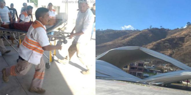 Los fuertes vientos que se registran en la cabecera municipal de Motozintla provocaron la caída de un domo de la unidad deportiva, hasta el momento se reportan una persona adulta herida y diez menores de edad.