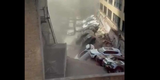 Imágenes difundidas en redes sociales permiten ver los automóviles apilados y uno de los pisos del estacionamiento totalmente colapsado.