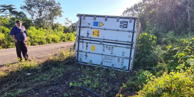 Kinchil, Yuc., 1 de noviembre.- Acostado entre la maleza quedó uno de los dos remolques que arrastraba un camión Freightliner sobre la carretera Kinchil-Celestún, ocurrido a la altura del kilómetro 57.