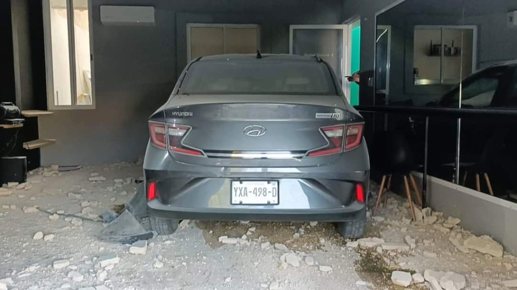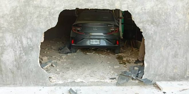 Mérida, Yuc., a 20 de marzo 2024.- Como en una escena de la caricatura del Correcaminos, así acabó dentro de un predio de la calle 27 con 30 del fraccionamiento La Florida un automóvil i10 luego de derribar el muro principal, y todo debido a que el conductor ‘pestañeo’ al volante.
