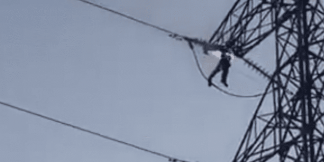 En un video que circuló por redes sociales se aprecia que el individuo está a unos 50 metros de altura donde recibe una descarga y su cuerpo se enciende en llamas.