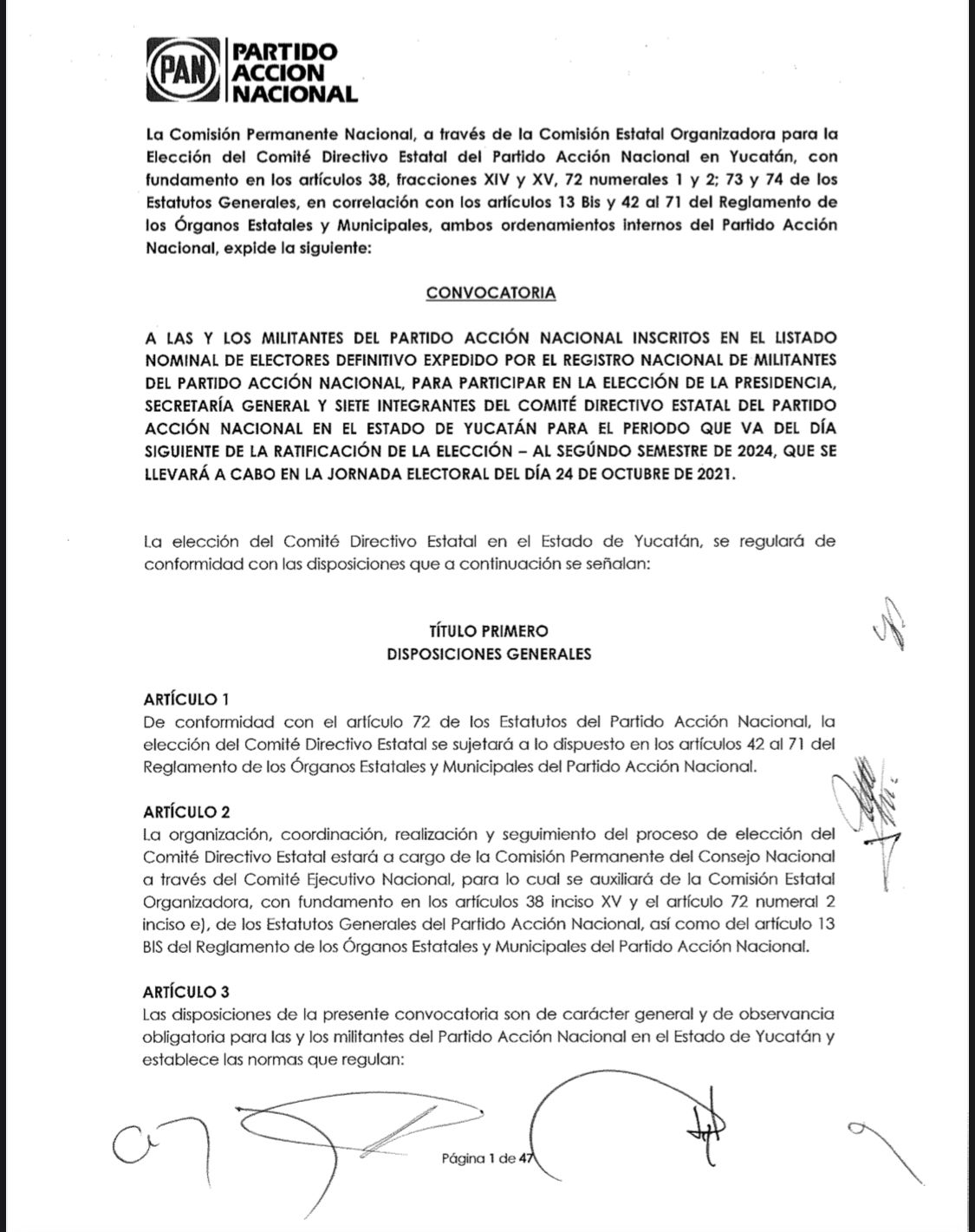 MÉRIDA, Yuc., 26 de agosto 2021.- Este miércoles se emitió la convocatoria para la elección del Presidente/a e integrantes del Comité Directivo Estatal Del PAN Yucatán, cuya jornada electoral se llevará al cabo el próximo 24 de octubre.