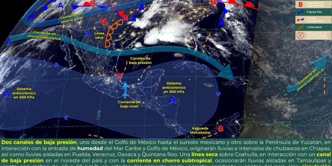 El ingreso de aire maritimo tropical proveniente del mar Caribe hacia la región, continuará generando cielo despejado a parcialmente nublado con probabilidad de lluvias aisladas en Quintana Roo, mientras que en Yucatán y Campeche no se esperan lluvias. Ambiente muy caluroso durante el día y cálido en la noche. Viento del sureste de 15 a 25 km/h y rachas mayores a 40 km/h en zonas costeras.