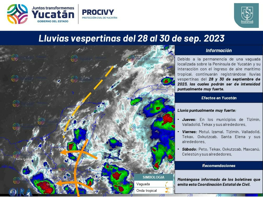 Con datos también del Servicio Meteorológico Nacional de la Comisión Nacional del Agua (Conagua) sobre los efectos de la referida onda tropical, las precipitaciones continuarán el viernes en los municipios de Motul, Izamal, Santa Elena, Oxkutzcab, Tizimín, Valladolid, Tekax y alrededores.