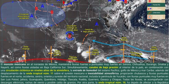 Mérida, Yucatán, 11 de julio de 2025.- El clima en Yucatán estará marcado por condiciones inestables durante las próximas 24 horas debido al paso de la onda tropical número 11, que, en combinación con un canal de baja presión sobre el sureste del país, generará cielo medio nublado a nublado, con probabilidad de chubascos acompañados de tormentas en toda la Península.