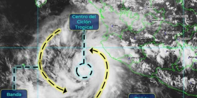 Sus bandas nubosas ocasionan lluvias puntuales intensas en Jalisco y Nayarit, además de muy fuertes en Colima y Michoacán.