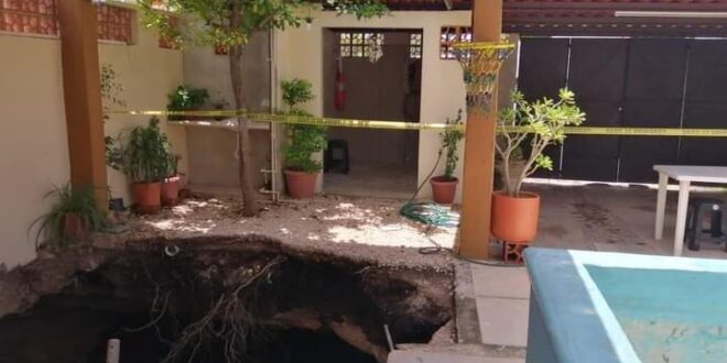 MÉRIDA, Yuc., 18 de junio 2021.- Vaya susto se llevaron los habitantes de un predio en la calle 110 con 59-G y 59-H de la colonia Bojórquez, cuando se abrió una especie de “socavón” en la terraza, de aproximadamente 6 metros de ancho y hasta 10 de profundidad.