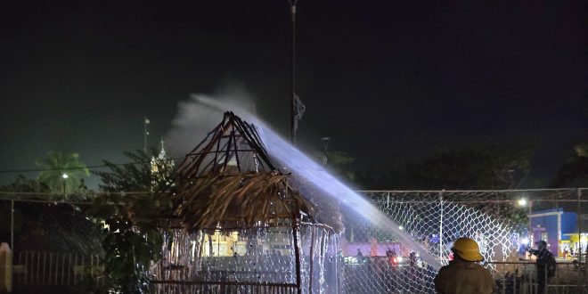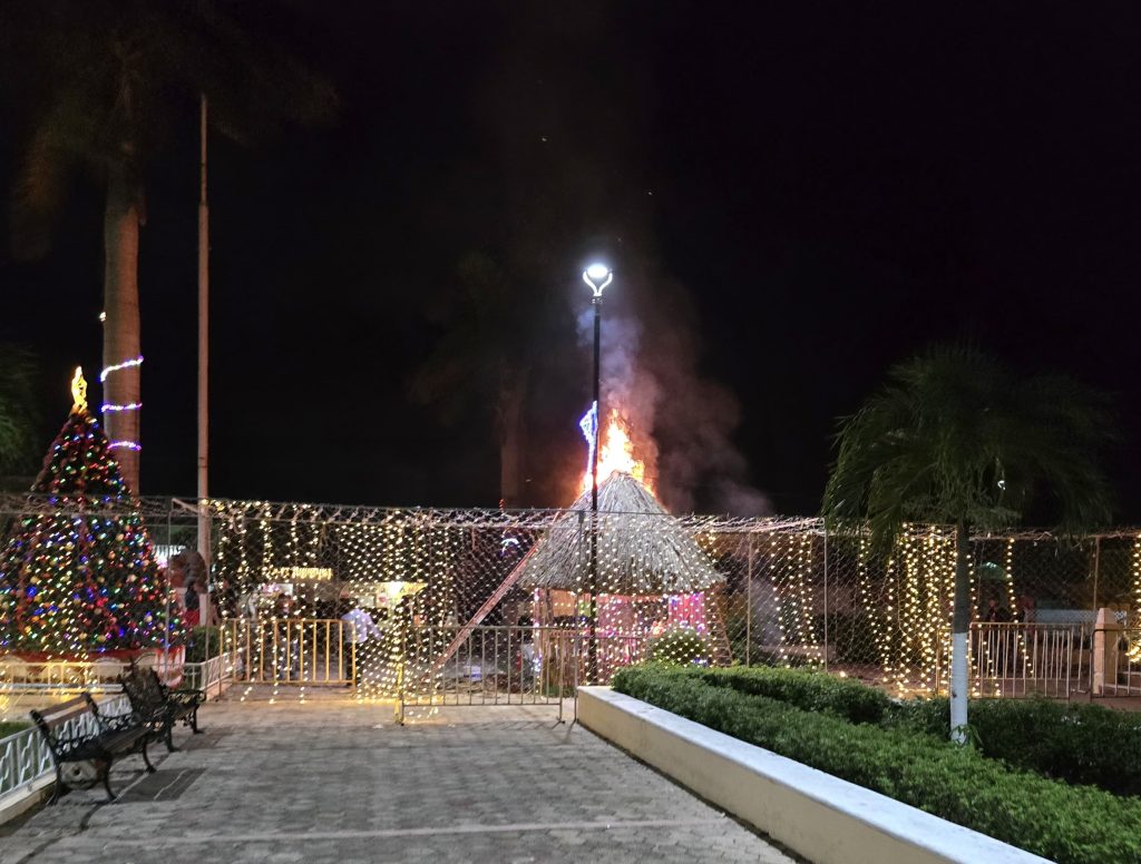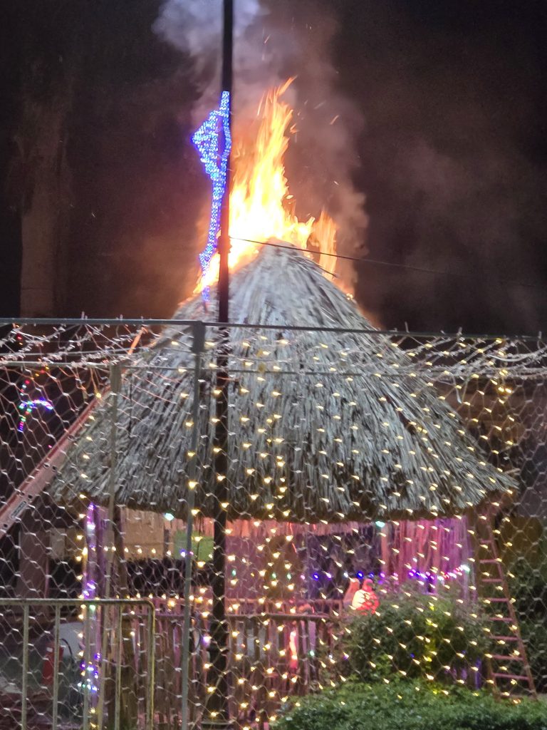 Kinchil, Yuc. a 02 de enero 2025.- Se quemó por completo una casita de madera y huano del nacimiento instalado en la plaza principal de este municipio, al parecer a causa de unas “bombitas” aunque la segunda versión se sospecha a un cortocircuito en las luces que lo adornan, esto en las primeras horas de este 1 de enero.