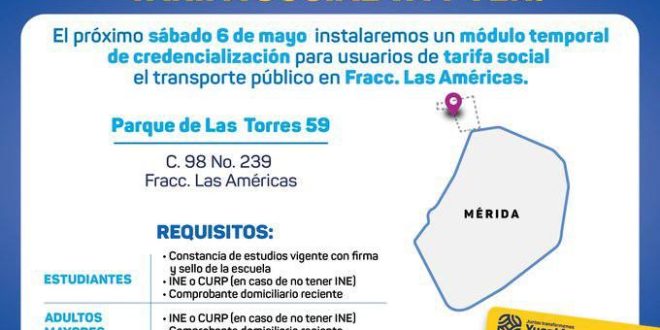 Mérida, Yucatán, 5 de mayo de 2023.- El Gobierno del Estado informa que con el objetivo de apoyar a las familias yucatecas y en continuación con la transformación del sistema de transporte público en el estado, el próximo sábado 6 de mayo se dispondrá un módulo itinerante en el fraccionamiento Las Américas donde el público podrá acudir para tramitar su tarjeta de tarifa social.