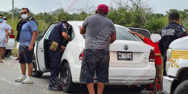 Asimismo agentes estatales comisionados en el entronque de Chunchucmil abanderaron el lugar del accidente para esperar el arribo de la Guardia Nacional, División Caminos.