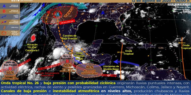 MÉRIDA, Yuc., 12 de agosto 2020.- En las próximas 24 horas, se prevé cielo medio nublado a nublado, con probabilidad para chubascos y tormentas, con temperaturas calurosas a muy calurosas durante el día y cálidas al amanecer.