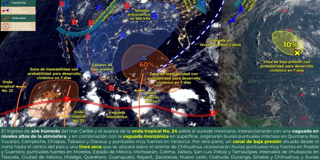 Un canal de bajas presiones en interacción con una vaguada en niveles superiores de la tropósfera, estarán provocando lluvias fuertes especialmente en el oriente, centro y sur de Yucatán, centro y sur de Campeche, así como en el norte y centro de Quintana Roo. Además, el ambiente se tornará caluroso a muy caluroso en el día y cálido al amanecer, con viento de componente este-sureste cambiando al noreste y noroeste dejando rachas de 40 km/h.