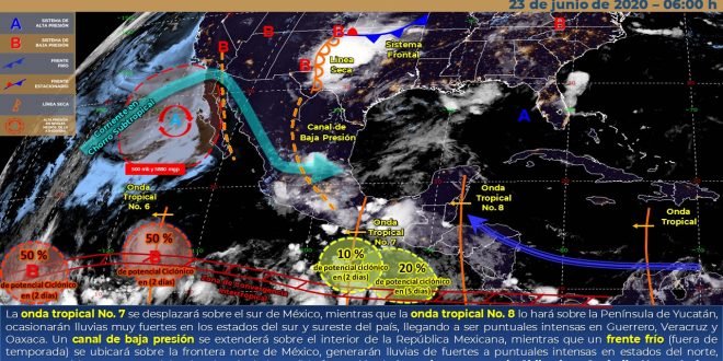 Se prevé que la onda tropical No.8 este cruzando el sur de la península de Yucatán, favoreciendo el aporte de humedad hacia el interior de la región, por lo que se esperan condiciones de cielo medio nublado durante el día, con probabilidad para lluvias con chubascos aislados en el centro y norte de Yucatán, así como chubascos con tormentas aisladas principalmente en el sur de Quintana Roo y la porción sur y suroeste de Campeche. Asimismo, se espera que las temperaturas oscilen en rangos de calurosas a muy calurosas durante el día y cálidas por la noche, viento de dirección este-sureste cambiando al este-noreste de 15 a 25 km/h y rachas de 45km/h en zonas costeras.
