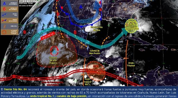 El establecimiento de un canal de bajas presiones sobre el sureste del país, aunado al fuerte calentamiento diurno y al ingreso de aire cálido y húmedo procedente del mar Caribe y golfo de México, daran paso al desarrollo de tormentas vespertinas a nocturnas, con probabilidad para intervalos de chubascos con tormentas fuertes especialmente en el noreste, centro-sur y noroeste de Yucatán, así como en el norte, centro y suroeste de Campeche, mientras que en el estado de Quintana Roo se prevén intervalos de chubascos con tormentas aisladas. Las temperaturas serán calurosas a muy calurosas durante el día y cálidas por la noche, con viento dominante de dirección este-sureste cambiando por la tarde al noreste de 20 a 30 km/h y rachas mayores a 50 km/h en zonas costeras.