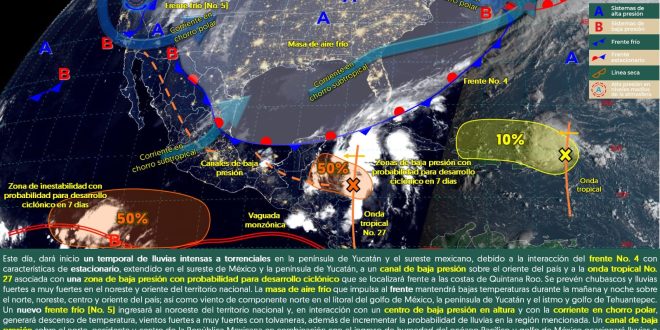 Se prevé que se presenten condiciones de cielo medio nublado a nublado, con probabilidad de lluvias muy fuertes a intensas en los tres estados de la región, debido a la interacción de frente No.4 con características de estacionario al norte de la península de Yucatán, con la onda tropical No.27, la cual tiene asociada una zona de baja presión con probabilidad de desarrollo ciclónico. Ambiente cálido a caluroso durante el día y cálido por la noche, con vientos del noreste de 20 a 40 km/h y rachas mayores a 50 km/h en el litoral.