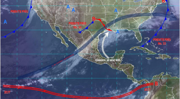 Las temperaturas se mantendrán en rangos de cálidas a calurosas durante el día y al amanecer serán de frescas a templadas especialmente en el cono sur de Yucatán, con vientos dominantes del este- sureste de 15 a 25 km/h, con rachas de 35 a 40 km/h. El frente frío No 34 se ubicará sobre el noroeste del golfo de México.