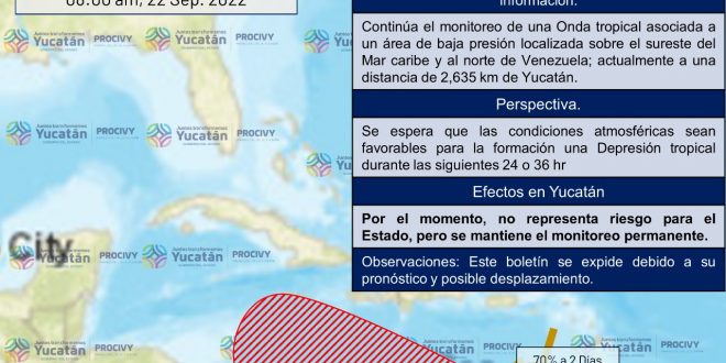Mérida, Yucatán, 22 de septiembre de 2022.- Una onda tropical con probabilidad de desarrollo, sin riesgo para Yucatán por el momento, se ubica en el Atlántico, al norte de Venezuela, informó la Coordinación Estatal de Protección Civil (Procivy), en cumplimiento a la instrucción del Gobernador Mauricio Vila Dosal, de informar y prevenir a la ciudadanía, durante esta temporada de huracanes.