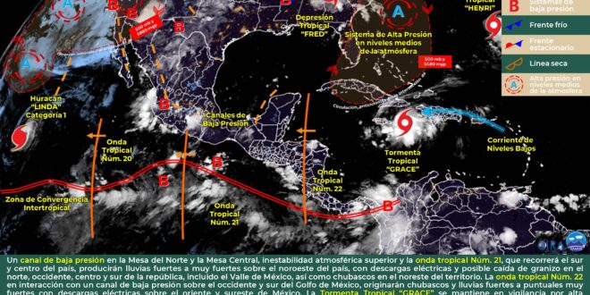 Se prevé que el ingreso de aire marítimo tropical, en combinación con el fuerte calentamiento diurno y la cercanía de la onda tropical 22, favorecerán condiciones de cielo medio nublado, con probabilidad para chubascos dispersos en el centro y sur de Quintana Roo, así como chubascos con tormentas en el oriente, sur y centro de Yucatán y el norte, centro y suroeste de Campeche. Las temperaturas serán calurosas a muy calurosas, con viento del este-sureste cambiando al noreste de 15 a 25 km/h y rachas de hasta 45 km/h. en zonas costeras.