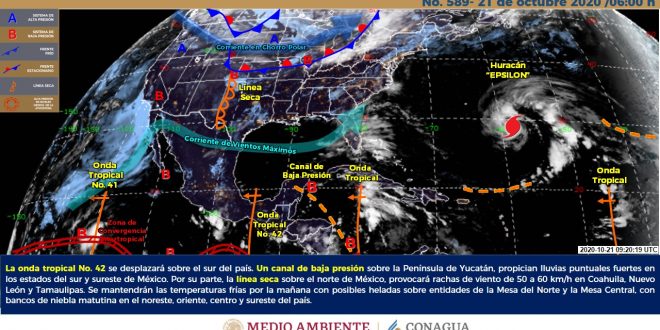 Se prevé que se presenten chubascos con tormentas fuertes principalmente en sectores del noreste y norte de Yucatán, norte de Quintana Roo, así como en el norte y suroeste de Campeche, así como lluvias de menor intensidad en el resto de la región, debido a la humedad asociada a la onda tropical No.42 la cual se desplaza por el sur del país, aunado a la inestabilidad provocada por un canal de bajas presiones que se extiende sobre el occidente del mar Caribe hasta el norte de la península de Yucatán. Las temperaturas serán calurosas durante el día y cálidas al amanecer, con vientos del norte- noreste en la costa de Yucatán y del oeste-noroeste en el resto de la región, con velocidades de entre 15 a 25 km/h y rachas de 40 km/h en zonas costeras.