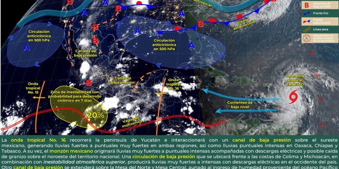 de la onda tropical No. 16 al sur de la región, ocasionarán probabilidad de tormentas puntuales fuertes en el norte y sur de Quintana Roo, asi como tormentas fuertes a muy fuertes en el centro, sur