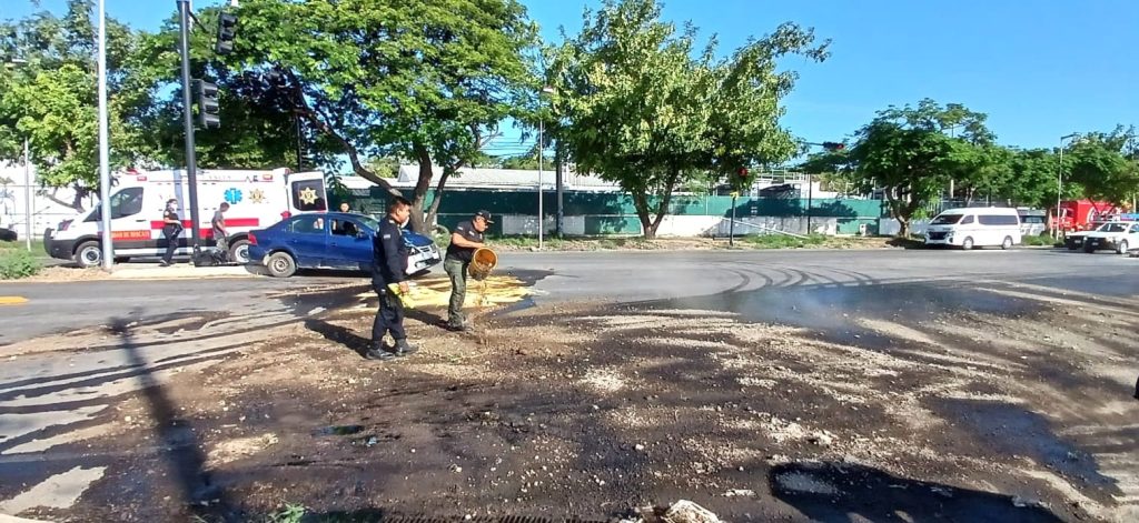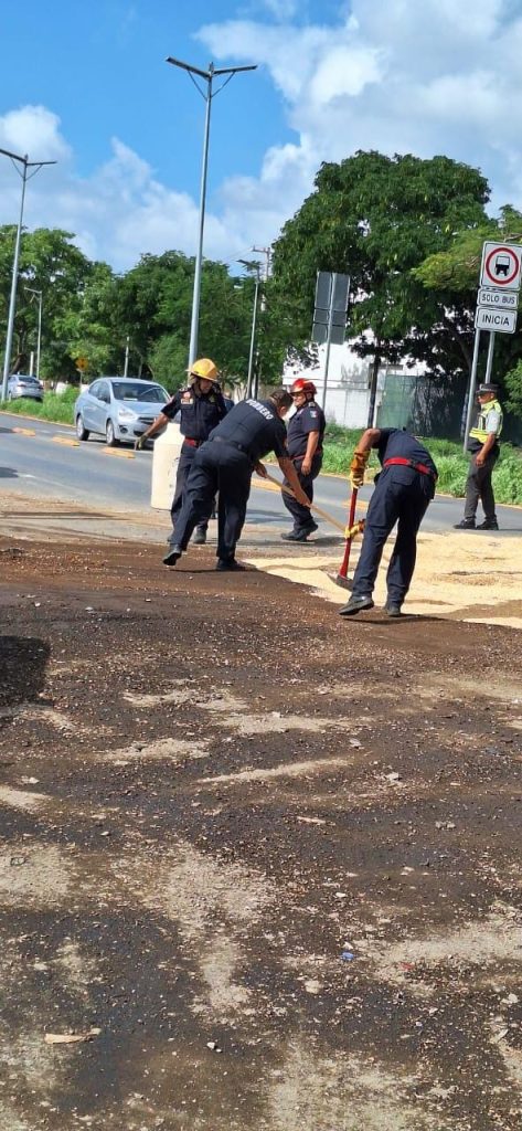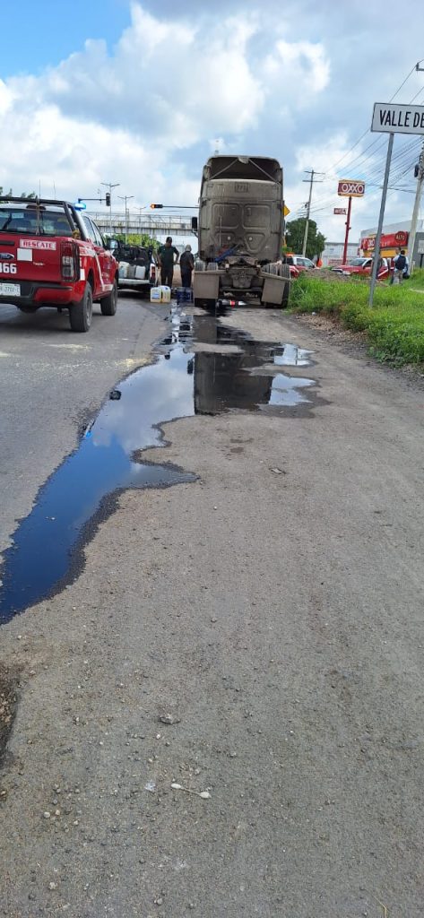 Al sitio arribaron los Cuerpos de Emergencia y la Policía Municipal, cuyos elementos procedieron abanderar el área para prevenir posibles derrapes por el viscoso combustible.
