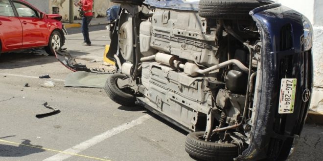 De nuevo el cruce de la calle 45 con 64 del centro de Mérida fue escenario de un fuerte accidente de tránsito, donde un auto de Uber chocó y propició la volcadura de un auto particular ayer a las 11:30 de la mañana.