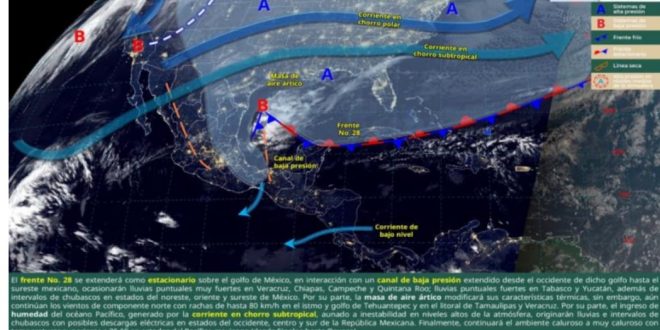 La influencia del frente estacionario núm. 28 sobre la península de Yucatán, estará dejando lluvias puntuales fuertes en el sur de Quintana Roo, chubascos en el oriente de Yucatán, así como en el sur de Campeche. Además, el ambiente será cálido a caluroso en el día y templado a cálido al amanecer. Los vientos de componente noreste de 15 a 20 km/h con rachas mayores a 40 km/h en zonas costeras.
