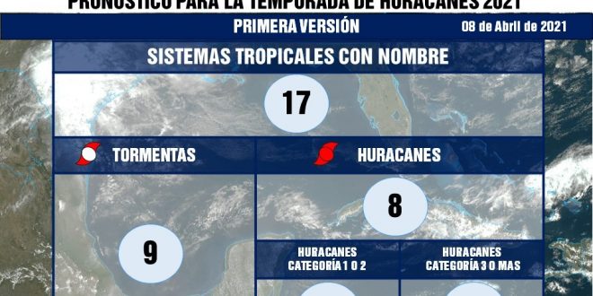 Debido a la transición del fenómeno de “la niña débil” a fase “neutral”, puntualizó, los pronósticos apuntan a la formación de tres incidencias adicionales, para un total de 17; por todo lo anterior, se espera una temporada activa para este 2021, la cual abarcará del 1 de junio al 30 de noviembre.