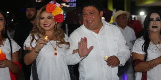 KANASÍN, Yuc., 30 de octubre 2025.- Catrinas, esqueletos, mestizas que retornaron de la muerte, ánimas, entre otros, participaron esta noche en el Paseo de las Ánimas en Kanasín, contingente que fue encabezado por el alcalde Edwin Bojórquez Ramírez y su esposa y presidenta del DIF de Kanasín, Raquel Balam Rocha de Bojórquez.