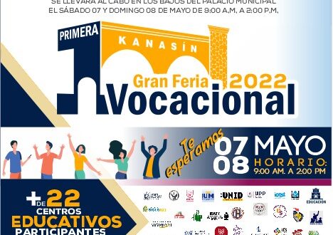 KANASÍN, Yuc., 04 de mayo 2022.- Con el objetivo de brindar a los jóvenes un amplio abanico de ofertas educativas que le permitan continuar con sus estudios, los próximos días 7 y 8 de mayo se llevará al cabo la Primera Feria Vocacional Kanasín 22, en la que participarán un total de 25 instituciones educativas desde el nivel primaria hasta universidad.