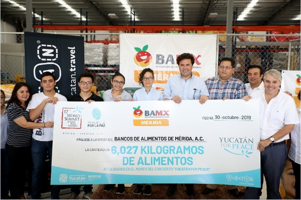 Mérida, Yucatán, 30 de octubre de 2019.- Esta mañana, la Secretaría de Fomento Turístico (Sefotur), que encabeza Michelle Fridman Hirsch, entregó más de seis toneladas de alimentos, recolectadas con el concierto _Yucatan for Peace_, al Banco de Alimentos de Mérida, como parte de la estrategia “Yucatán hambre cero”, que impulsa el Gobierno de Mauricio Vila Dosal, en beneficio de las comunidades más vulnerables de la entidad.