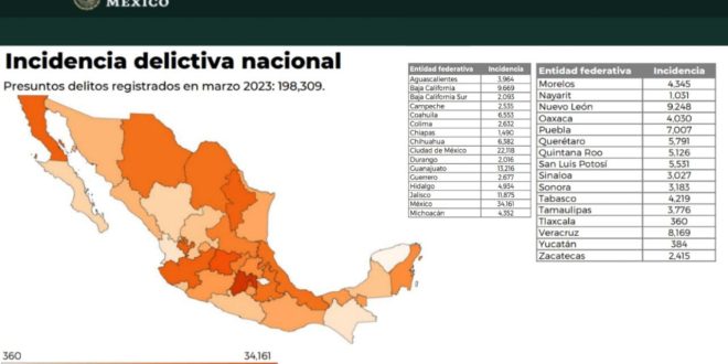 -En marzo se registraron 45.19 delitos por cada 100,000 habitantes, tasa más de 9 veces menor a la nacional, de 413.09.