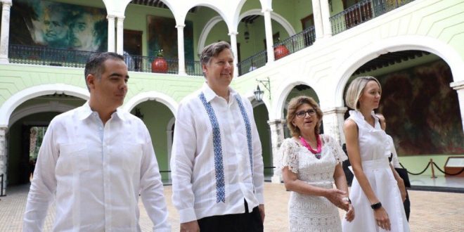 El diplomático estadounidense, quien realiza una visita a Yucatán, fue recibido a las puertas de la sede del Poder Ejecutivo por la secretario General de Gobierno, María Fritz Sierra y el subsecretario de Inversión, Desarrollo Económico y Financiamiento de la Secretaría de Fomento Económico y Trabajo, Gerardo Díaz de Zavala.