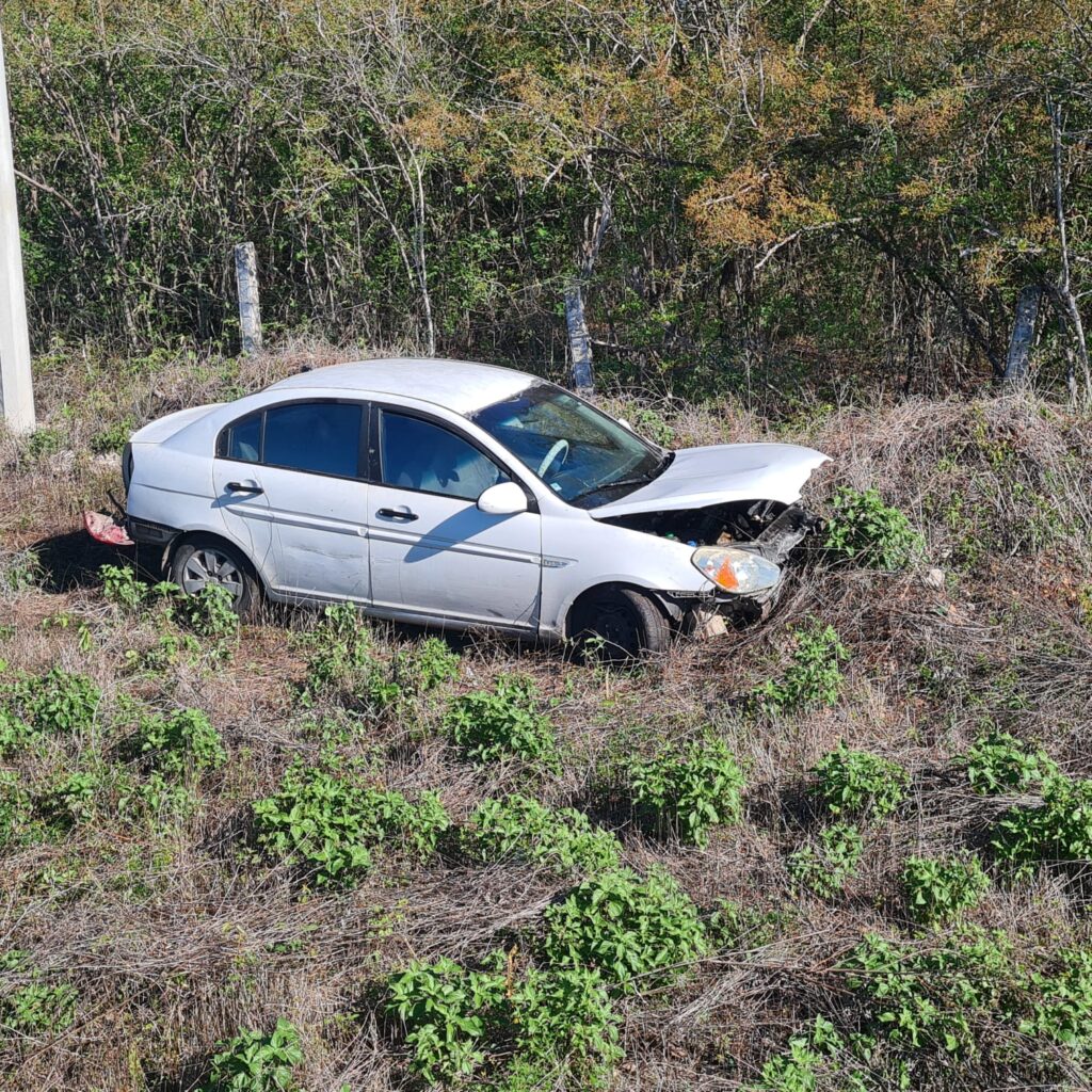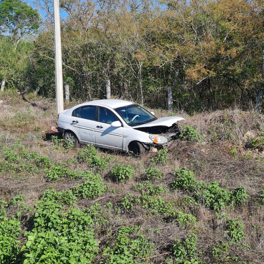 Hunucmá, Yuc., 28 de marzo 2022.- Un vehículo Dodge Attitude terminó en la cuneta de la vía federal Mérida-Tetiz, para ser abandonado la mañana de este domingo a la altura del kilómetro 11+800.