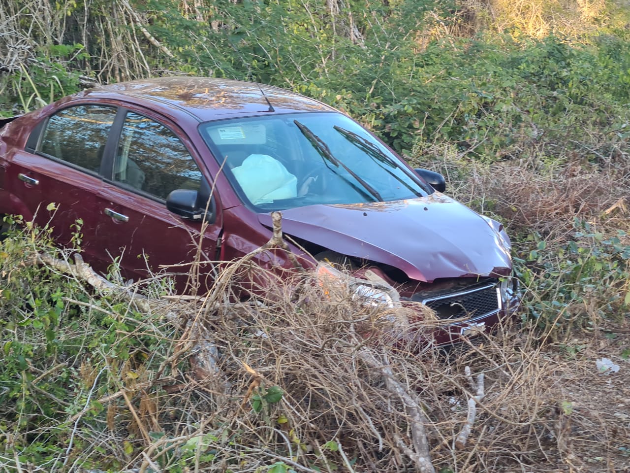 Kinchil, Yuc., 11 de febrero.- Una aparatosa salida tuvo esta tarde el guiador “fantasma” de un automóvil Aveo, cuyo accidente se registró en la vía Kinchil – Celestún.