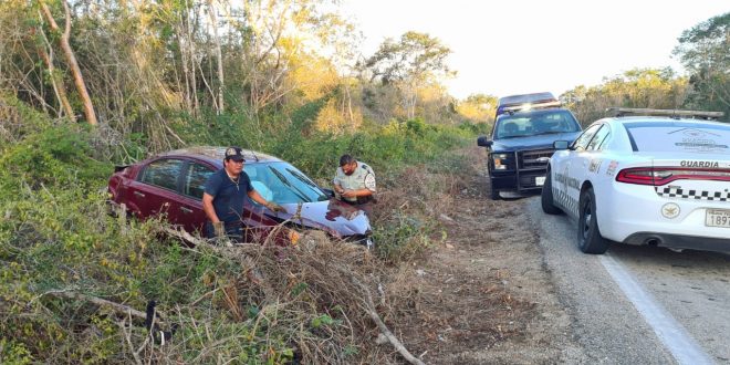Según los hechos al filo de las 4 de la tarde se dio aviso de este percance suscitado a la altura del kilómetro 57, mero de la “curva de la muerte” por lo que al arribar los agentes de la Secretaría de Seguridad Pública, solo encontraron el compacto con matrícula YWS3677C, clavado dentro los matorrales y con severos daños materiales, pues la bolsa de aire donde viajaba el conductor se activo, como quien dice ya es pérdida total.