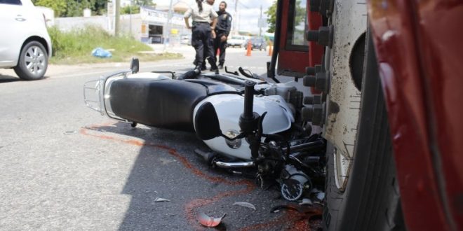 El motociclista cayó a unos metros y fue golpeado por la pesada unidad.