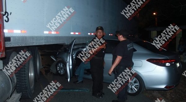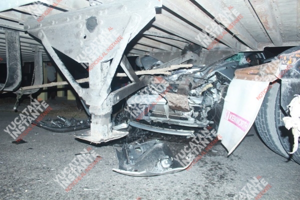 Samahil, Yuc., 18 de febrero 2020.- De milagro se salvaron de quedar prensados los ocupantes de un vehículo Toyota Yaris, al acabar incrustados debajo de un tractocamión esta madrugada.