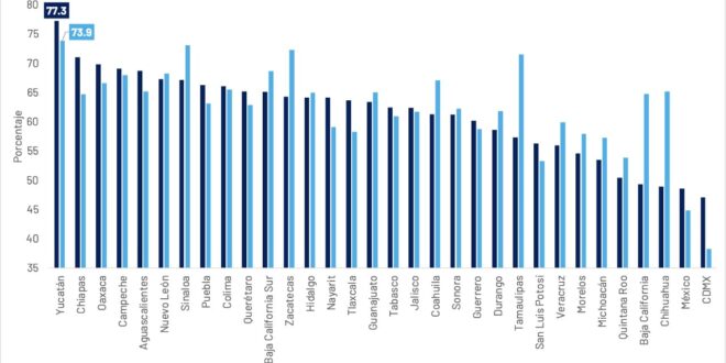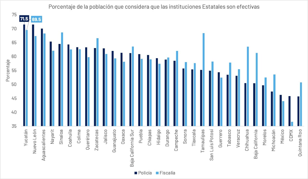 Asimismo, el 77.3% de los yucatecos manifestó su confianza en la Policía estatal, resultado superior al 58.6% del país, mientras que el 73.9% expresó lo mismo hacia la FGE, que se situó arriba de la tasa nacional, de 57.7%, por ello, Yucatán lidera en estos dos indicadores.