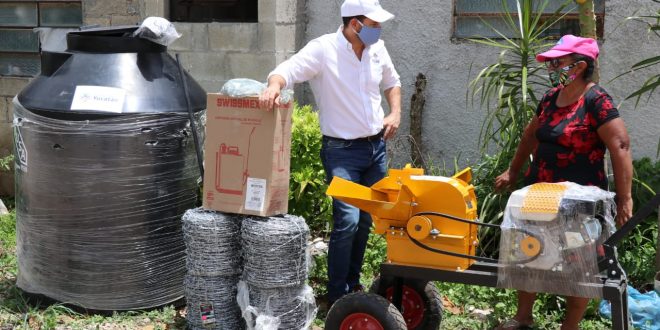El señor Gregorio Caamal Méndez manifestó su agradecimiento, ya que su suegro fue beneficiado aunque nunca había recibido estímulos para mantener su rancho; ahora, a sus más de 70 años, se le entregó una picadora de forraje, un tanque de almacenamiento para agua, alambre de púas, una bomba fumigadora y otros artículos que potenciarán la eficiencia en su unidad.