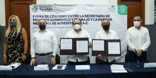 Mérida, Yucatán, 5 de julio de 2022.- Con miras hacia la consolidación de Yucatán como referente en el cumplimiento de normas y desarrollo del Sistema Nacional de Infraestructura de la Calidad, el Gobierno que encabeza Mauricio Vila Dosal, por conducto de la Secretaría de Fomento Económico y Trabajo (Sefoet), firmó un convenio de colaboración con la Entidad Mexicana de Acreditación (EMA).