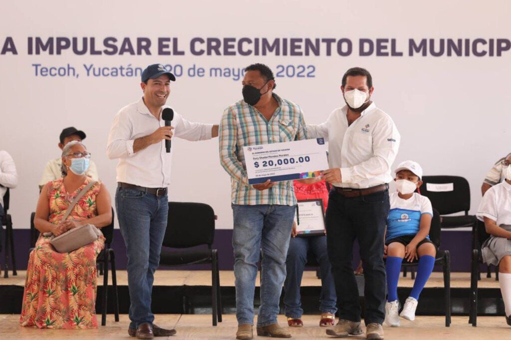 En su visita por ese municipio, Vila Dosal también continuó con la distribución de ejemplares de achiote, cajas para apicultores, certificados de vivienda, mobiliario escolar, cheques del programa Mejoramiento Genético y alimento para ganado tanto bovino como ovino durante la temporada de sequía.