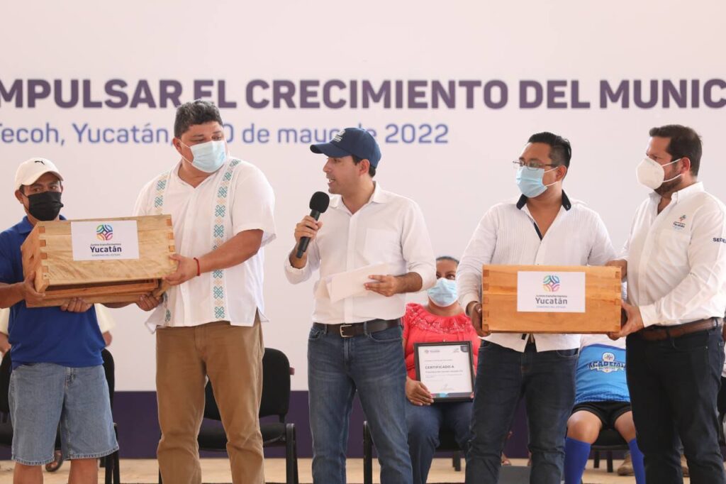 Luego, Vila Dosal entregó cajas completas para abejas, mediante el plan Apoyo para la Adquisición de Equipo Apícola, de un total de 25,000, para incrementar la infraestructura productiva, en beneficio de 5,000 hombres y mujeres que se dedican a esta labor, a través de un esfuerzo de 11 millones de pesos.
