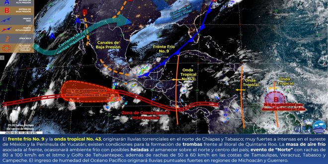 El frente frío no.9, extendido desde el oriente hasta el sureste de México, pasando sobre Yucatán y Campeche. Por otro lado, sobre el mar Caribe y Quintana Roo ingresa aire cálido asociada a una nueva onda tropical sobre Honduras.