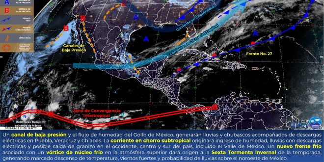Se espera que la masa de aire frío sobre la península de Yucatán, continúe generando condiciones de cielo medio nublado y probabilidad para lloviznas dispersas en el norte, centro y oriente de Yucatán, norte, oriente y sur de Campeche, así como lloviznas con intervalos de chubascos en el norte y sur de Quintana Roo. Temperaturas cálidas durante el día y frescas a templadas al amanecer. Viento dominante de dirección noreste de 15 a 25 km/h y rachas de 40 km/h en zonas costeras.