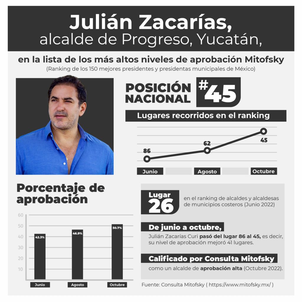 PROGRESO, Yuc., 28 de octubre 2022.- La casa encuestadora Mitofsky presentó las estadísticas de aprobación de alcaldes de octubre 2022, lista en la que resalta Julián Zacarías Curi, alcalde de Progreso
