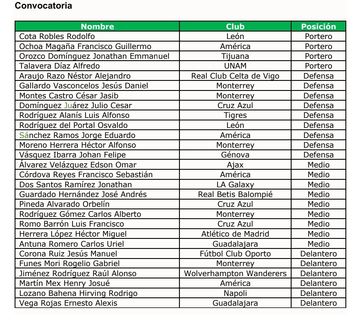 En la lista destacan los llamados de ocho jugadores que están en Europa, siendo los regresos de Raúl Jiménez, Héctor Herrera e Hirving Lozano y el primer llamado de Johan Vásquez ya como futbolista europeo, los que más llaman la atención.