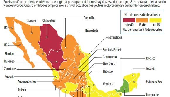 En la actualización del semáforo de riesgo epidémico, que estará vigente en México del 9 al 22 de noviembre, dos entidades, Chihuahua y Durango, se encuentran en rojo con riesgo máximo; 18 en naranja, con riesgo alto, entre las que está Ciudad de México; 11 en amarillo, con riesgo medio, y uno en verde, Campeche, con bajo.