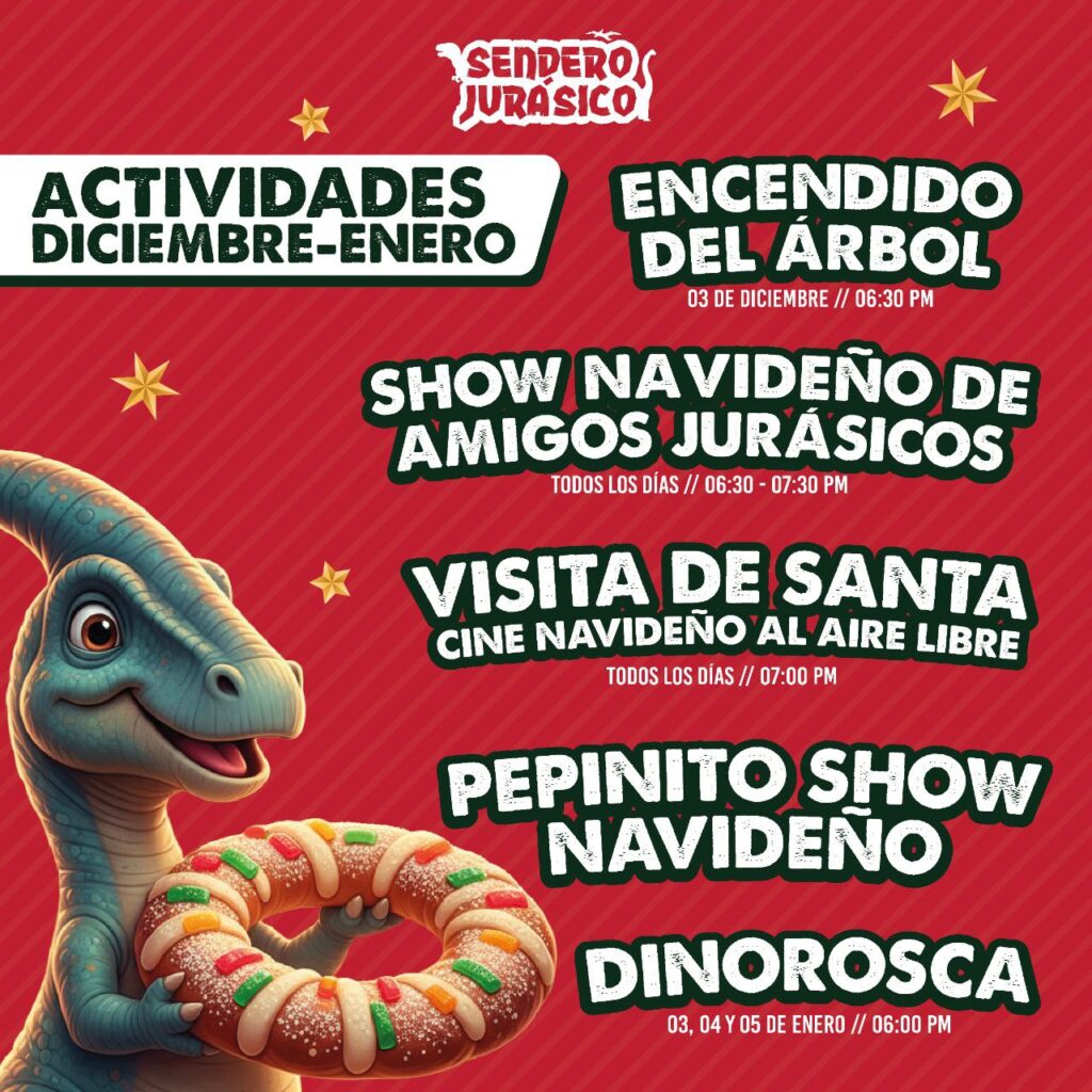 Asimismo, se realizarán la Visita de Santa y el Cine Navideño, actividades al aire libre disponibles diariamente desde las 7:00 p.m. Para completar la diversión, se presentará el Pepinito Show Navideño y se celebrará la tradicional Dinorosca los días 3, 4 y 5 de enero de 2026 a partir de las 6:00 p.m.